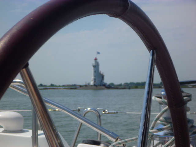 Unser Start war wie schon so oft Hindeloopen. Unser erstes Ziel auch wie schon so oft Texel. Aber heute wurde es doch etwas schwieriger als normal. Mitten in der Hafeneinfahrt in Hindeloopen stand ein Bagger, der die langsam versandende Einfahrt wieder frei macht und festgemacht an diesem Bagger ein Frachtschiff, das den ganzen Modder wegfährt. Wer die Einfahrt kennt, weiß, dass man sich hier möglichst in der Fahrrinne aufhalten sollte, da es zu beiden Seiten schnell flach wird. Wir haben auf die Kennzeichnung vertraut, die der Bagger an der Steuerbordseite mit 2x grün zeigte. Nachdem wir die Ausfahrt passiert hatten wehte der Wind auch entgegen der Vorhersagen schnell mit 22-25 Knoten von Nordwest. Wir gingen direkt ins 2. Reff und steuerten hart am Wind Den Oever an.